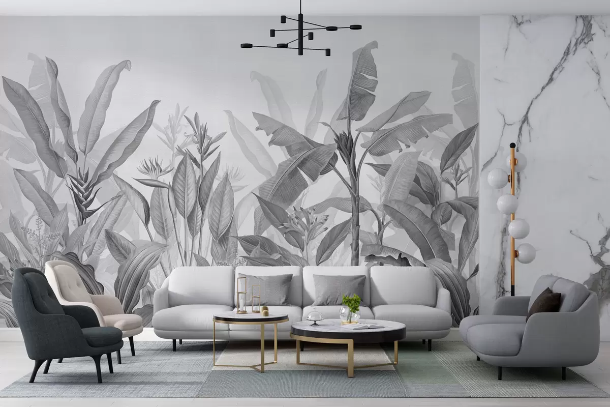 Murais de parede Folhas e flores tropicais a preto e branco sobre um fundo claro Nr. w01834v3