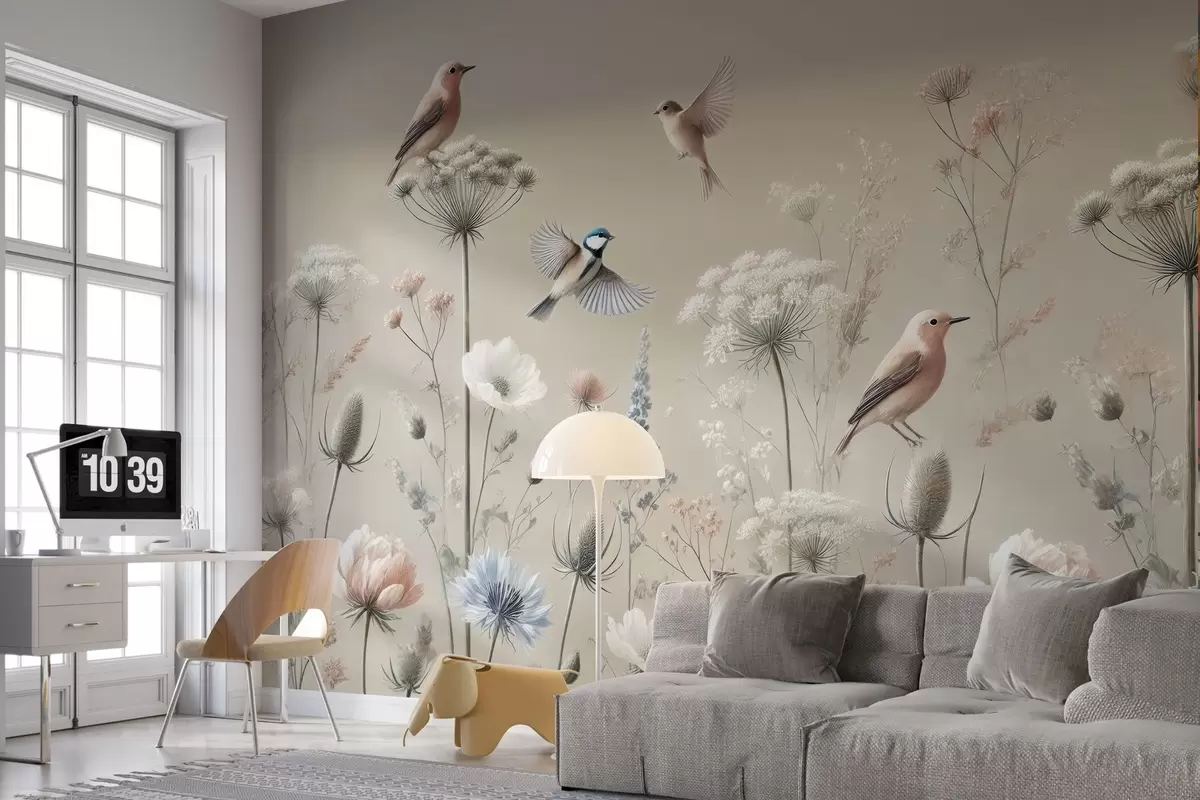 murais de parede Flores silvestres delicadas com pássaros sobre um fundo bege w01958