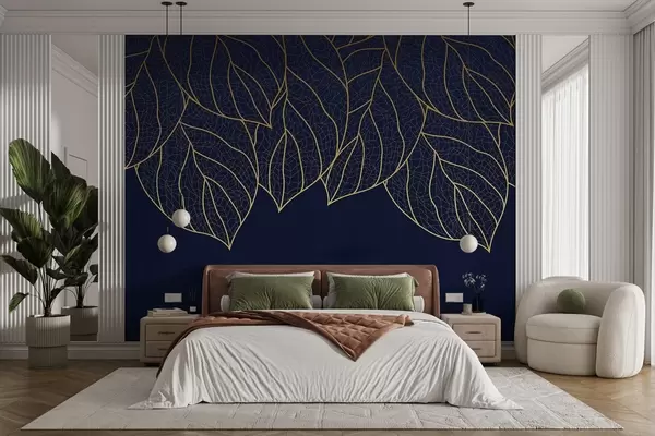 Murais de parede Papel de parede minimalista com silhuetas de grandes folhas amarelas com veios sobre um fundo azul Nr. w01960v3