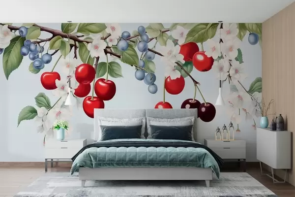 Murais de parede Jardim de bagas: ramos com cerejas, mirtilos e flores Nr. w01975