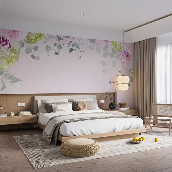 Murais de parede flores cor-de-rosa em folhas verdes no topo Nr. w02016