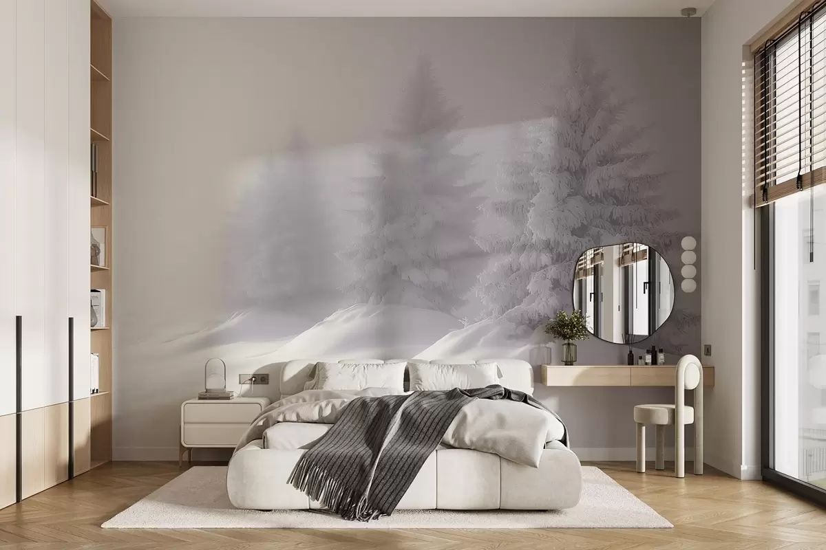 Murais de parede Abetos nevados na solidão de uma manhã de nevoeiro Nr. w02065