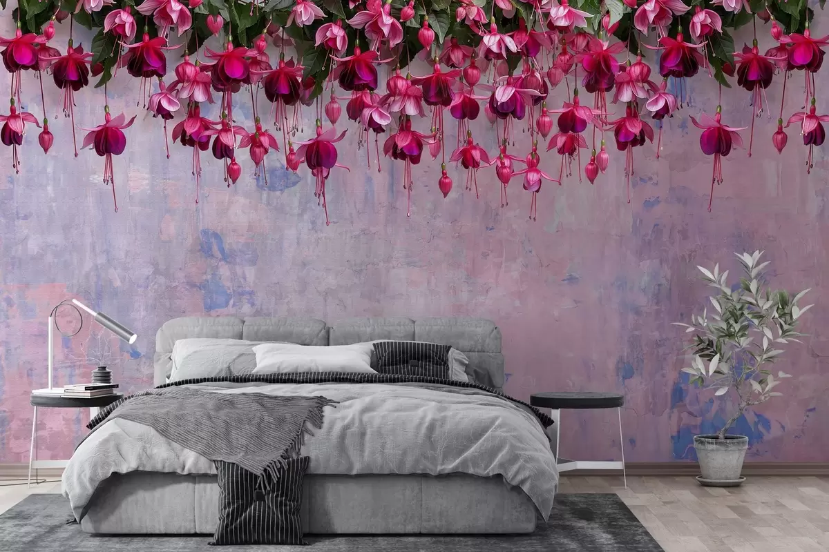 Murais de parede Grandes flores fúcsia penduradas no fundo de uma parede retro com imitação de arranhões Nr. w02132