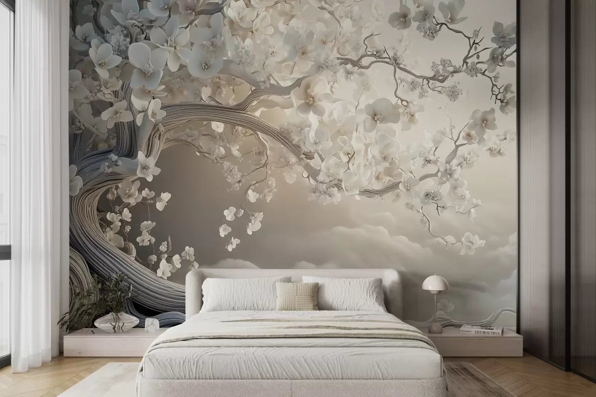 Murais de parede Uma árvore encantadora com flores brancas contra o fundo de nuvens num estilo interessante em delicadas cores quentes Nr. w02133
