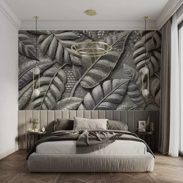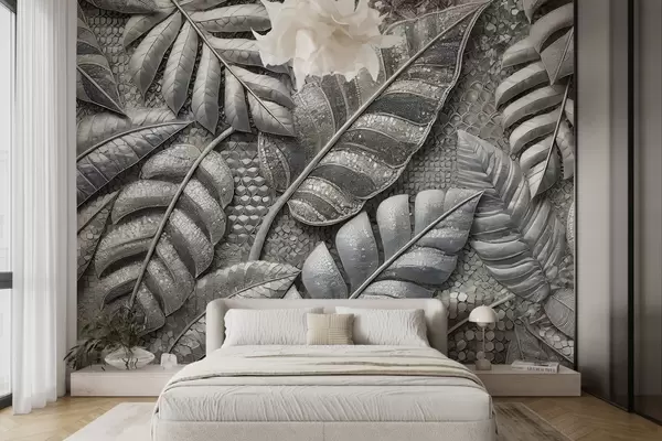 Murais de parede Grandes folhas tropicais em delicados tons de prata, num estilo de mosaico texturado Nr. w02135
