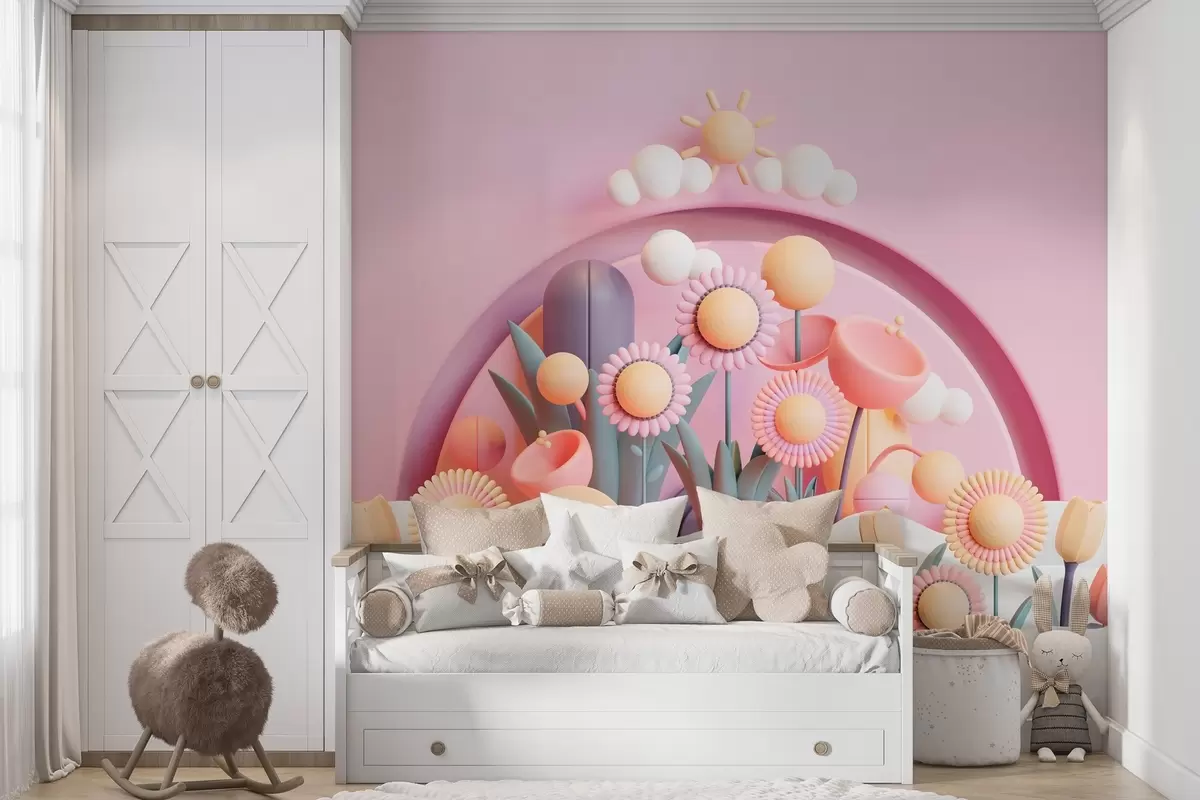 Murais de parede Papel de parede infantil em estilo 3D com flores e nuvens em tons de cor-de-rosa Nr. w02136