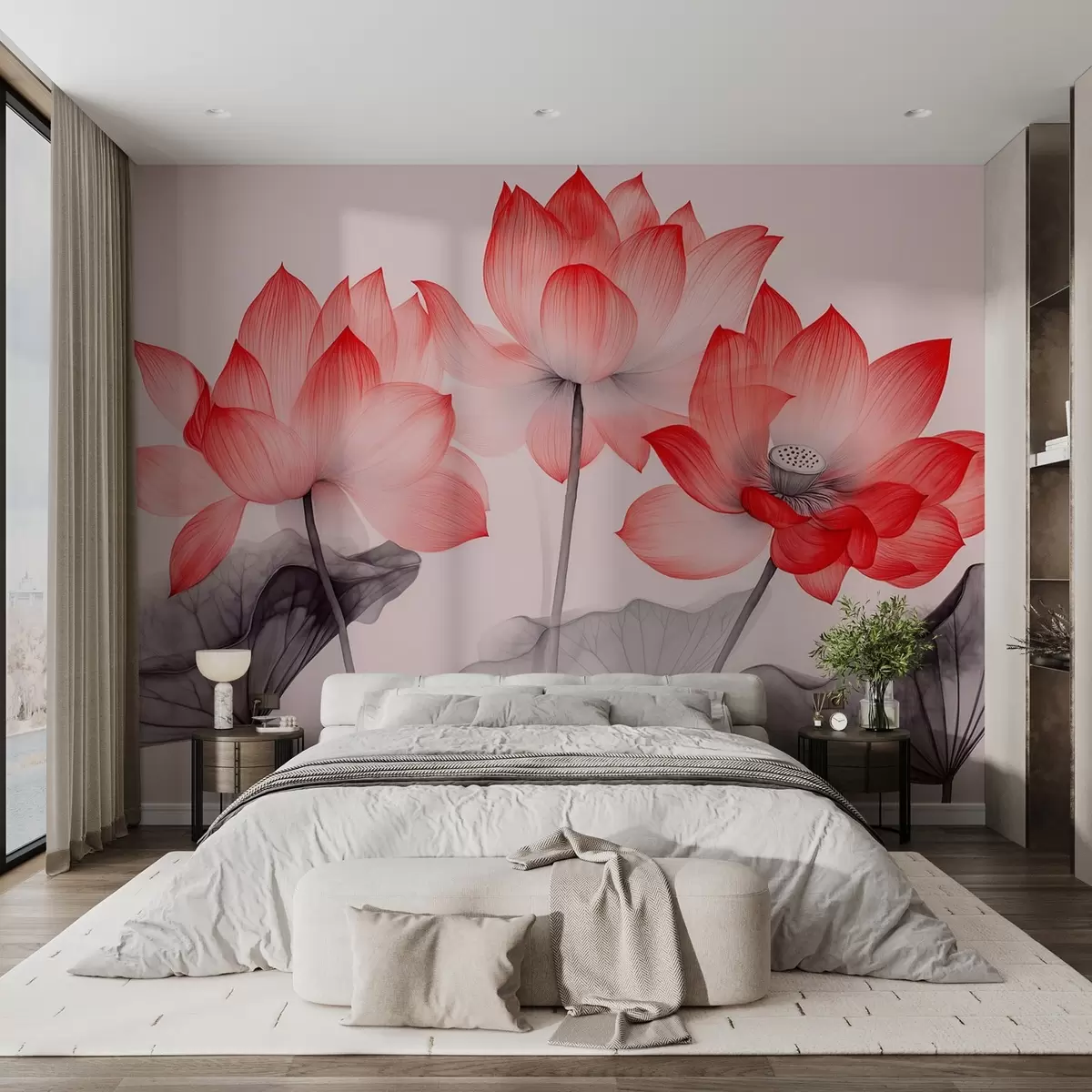 Murais de parede Três flores de lótus vermelhas em estilo de pintura chinesa Nr. w02146