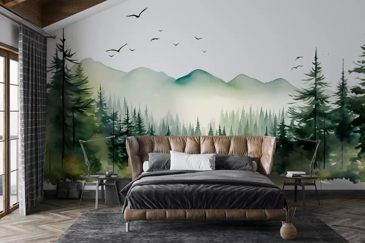 Murais de parede Paisagens de floresta e montanha em aguarela, paleta de cores verde Nr. w02150