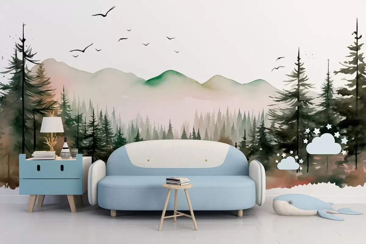 Murais de parede Paisagens de floresta e montanha em aguarela, cores verde e rosa Nr. w02150v1
