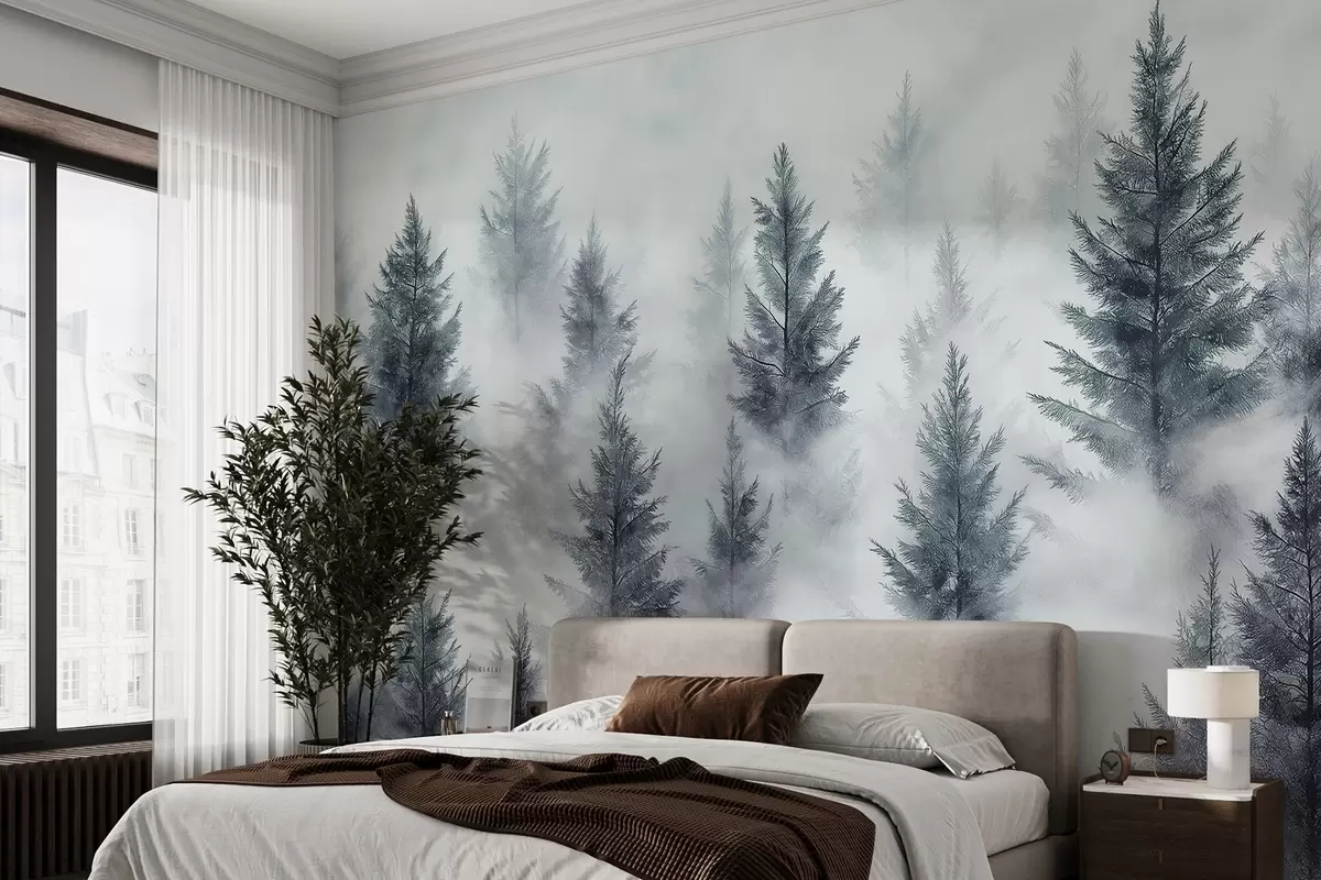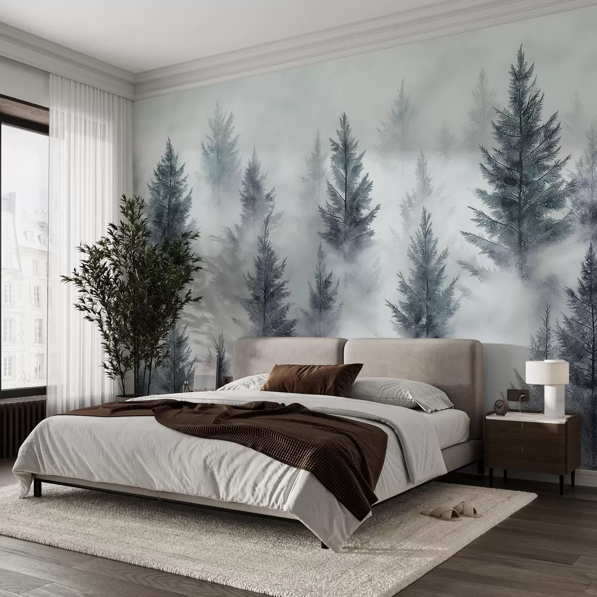 Murais de parede Bela floresta com pinheiros, nevoeiro, paisagens naturais, cores cinzentas Nr. w02222v2