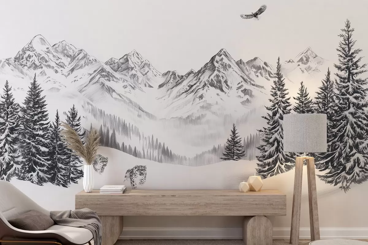 Murais de parede Montanhas de inverno, leopardos da neve, floresta de pinheiros, desenho a lápis, águia voadora Nr. w02360