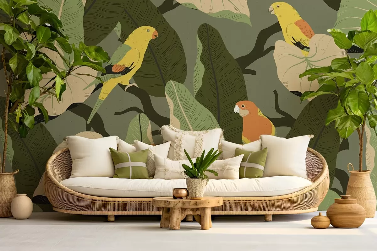 Murais de parede folhas tropicais com papagaios Nr. w02402