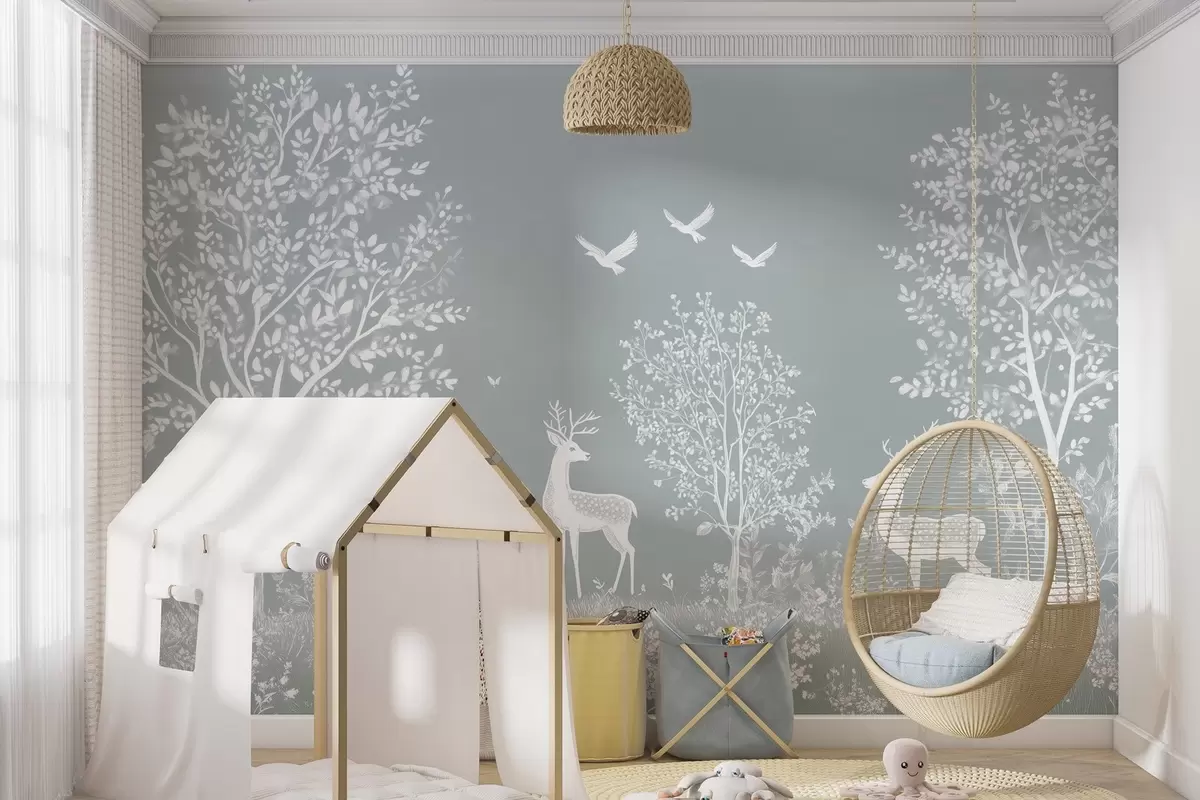 Murais de parede floresta com veados ao estilo de um desenho a giz sobre um fundo cinzento Nr. w02444v2