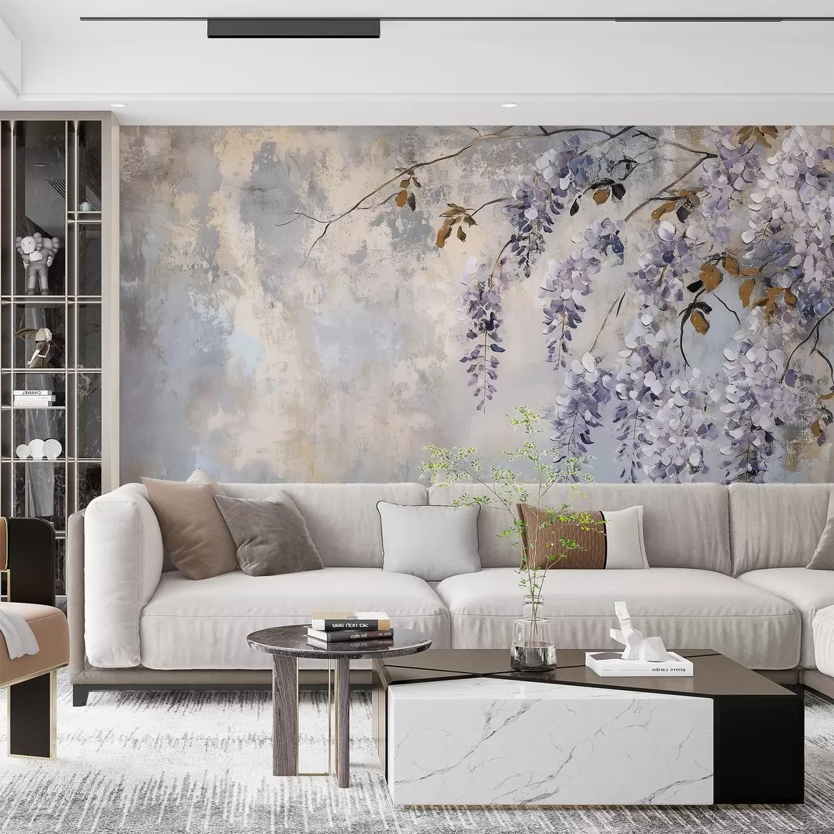 Murais de parede papel de parede texturado em cores suaves e discretas com delicadas flores e ramos de glicínias. Nr. w02451
