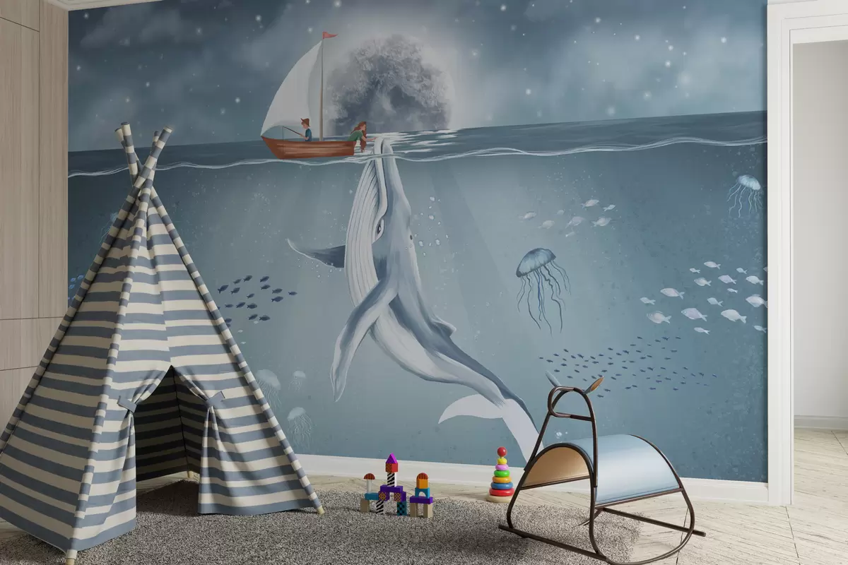 Murais de parede Desenho infantil com baleia, lua e barco com crianças Nr. w02476