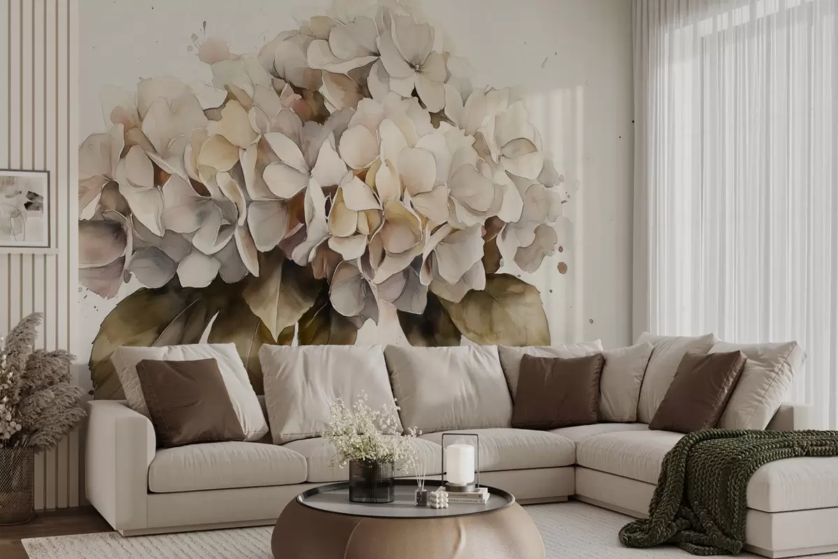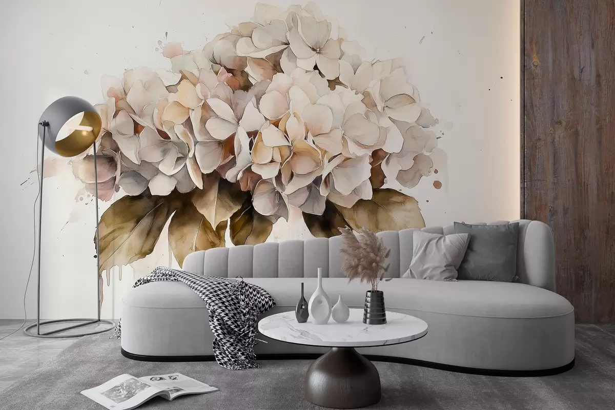 Murais de parede Desenho a aguarela de uma flor de hortênsia, cores bege Nr. w02485