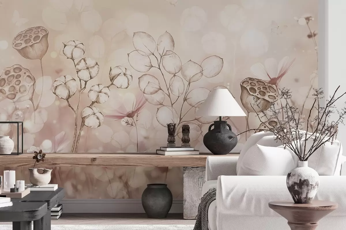Murais de parede Jardim de flores de sonho, borboleta, flores de algodão, lótus, cores bege Nr. w02516v3