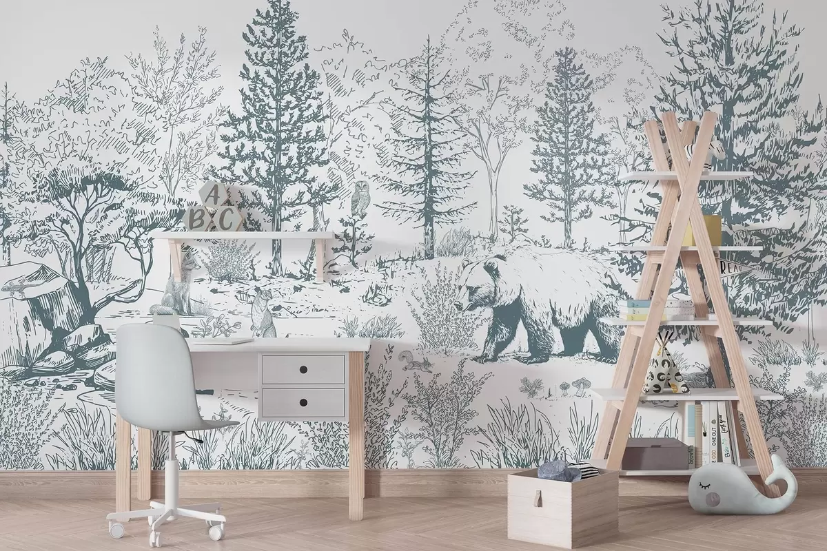 Murais de parede Vida na floresta, árvores, animais selvagens, urso, raposa, coruja, arbustos, desenho a lápis, cores azuis Nr. w02929v1
