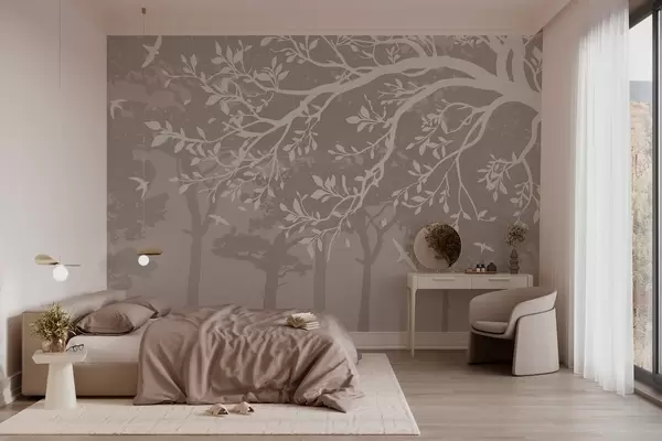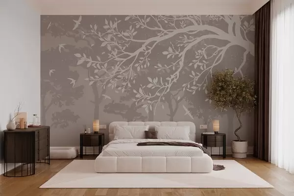 murais de parede silhueta de um ramo de árvore cremoso com pássaros, no fundo da floresta w03116