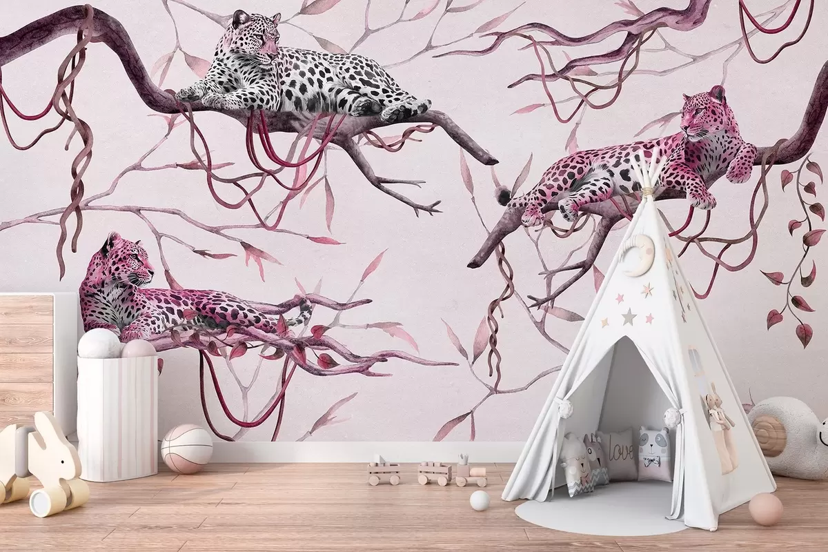 murais de parede Leopardos nas árvores da selva, cipós, tropical, animais selvagens, palete de cores rosa w03146v2