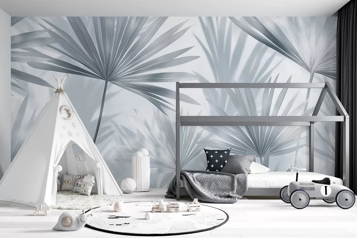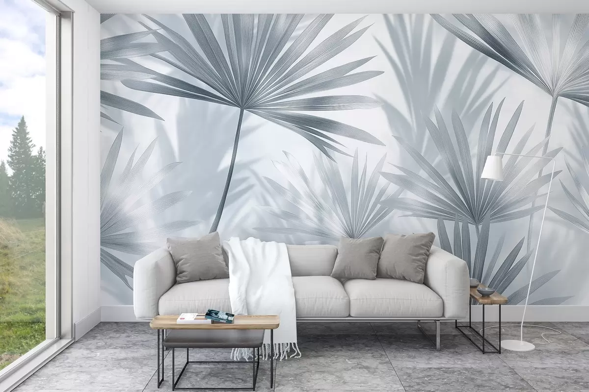 Murais de parede Folhas de palmeira, padrão floral, minimalismo, tropical, cores cinzentas Nr. w03152v1