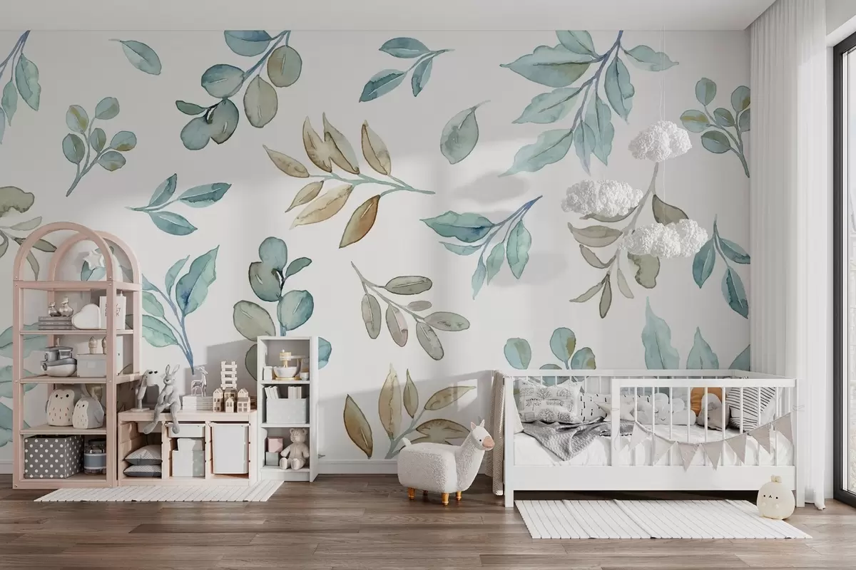 Murais de parede várias folhas e ramos em técnica de aguarela em tons de azul e bege sobre um fundo branco Nr. w03280