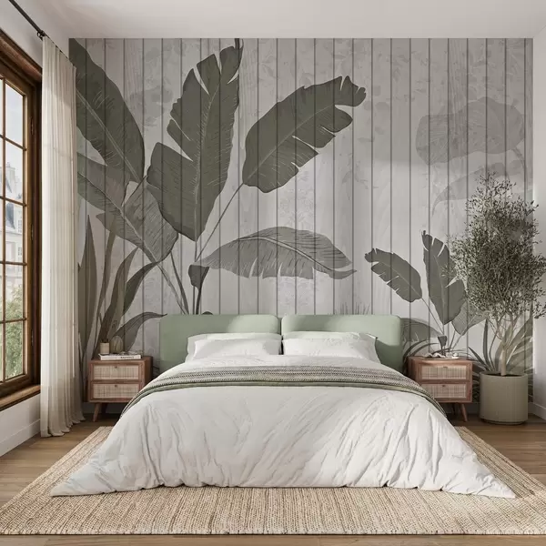 Murais de parede Ilustração botânica elegante com folhas de bananeira e plantas exóticas sobre um fundo claro texturado Nr. w03325