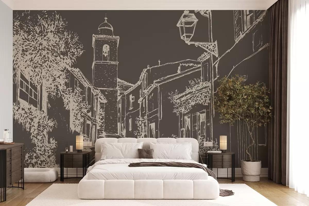 Murais de parede Rua da cidade, arquitetura bonita, edifícios, Mediterrâneo, desenho de linhas, cor escura Nr. w03345v2
