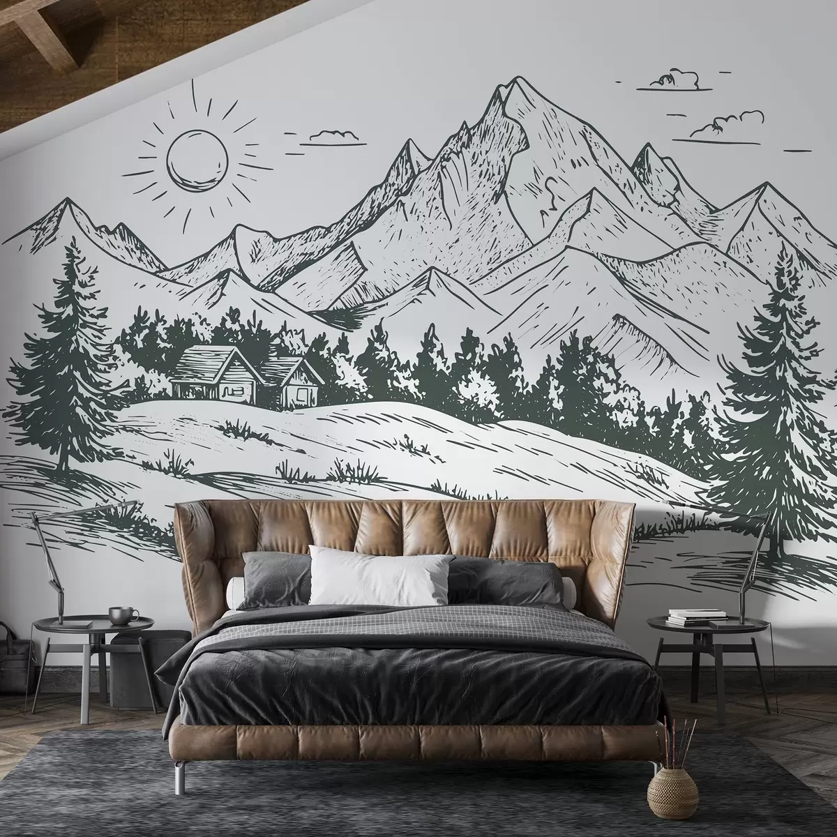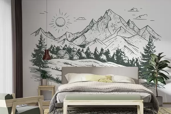 Murais de parede Desenho de montanhas, paisagens naturais, floresta, casas de madeira, cor verde Nr. w03347