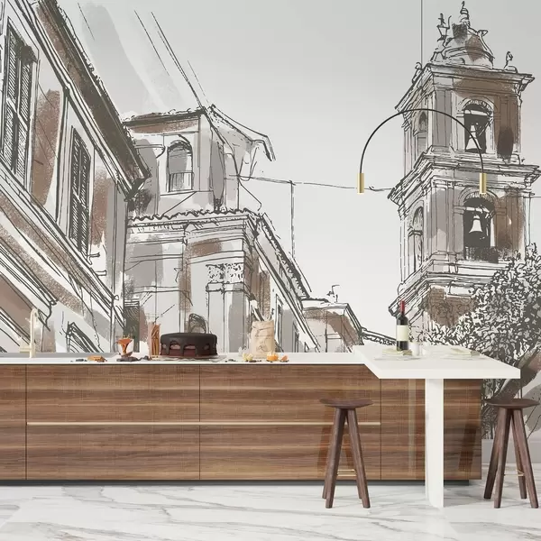 Murais de parede Rua de cidade mediterrânica, capela, arquitetura, cores bege e castanho Nr. w03350v1