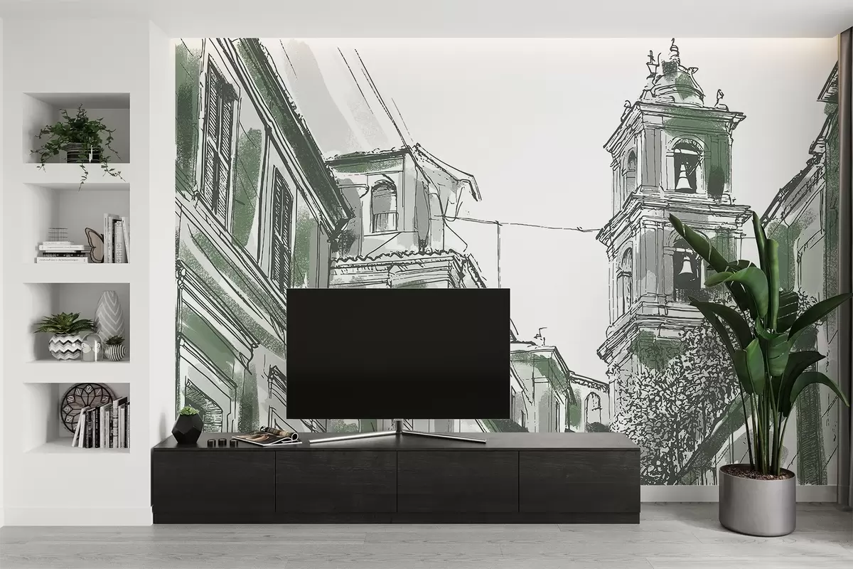 Murais de parede Rua da cidade mediterrânica, capela, arquitetura, cores cinzentas e verdes Nr. w03350v2