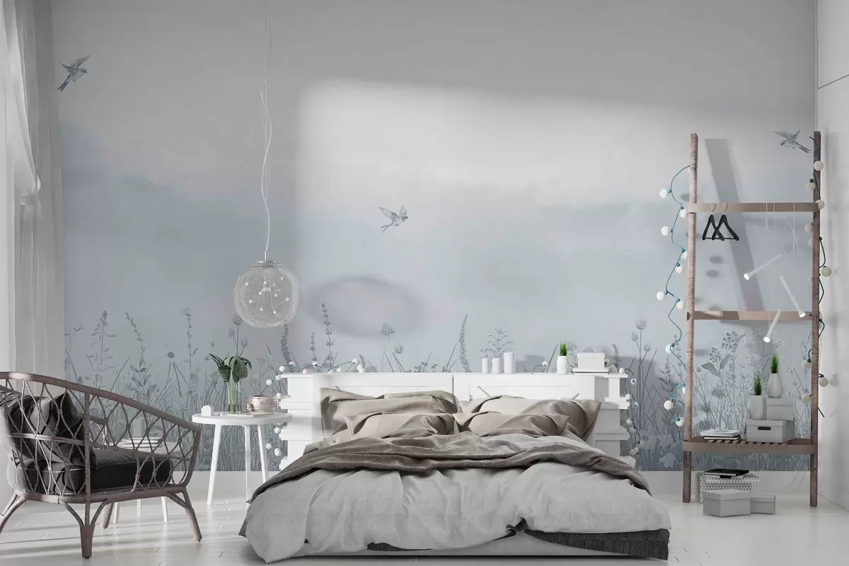 Murais de parede Flores silvestres e céu enevoado em tons azuis Nr. w03391v1
