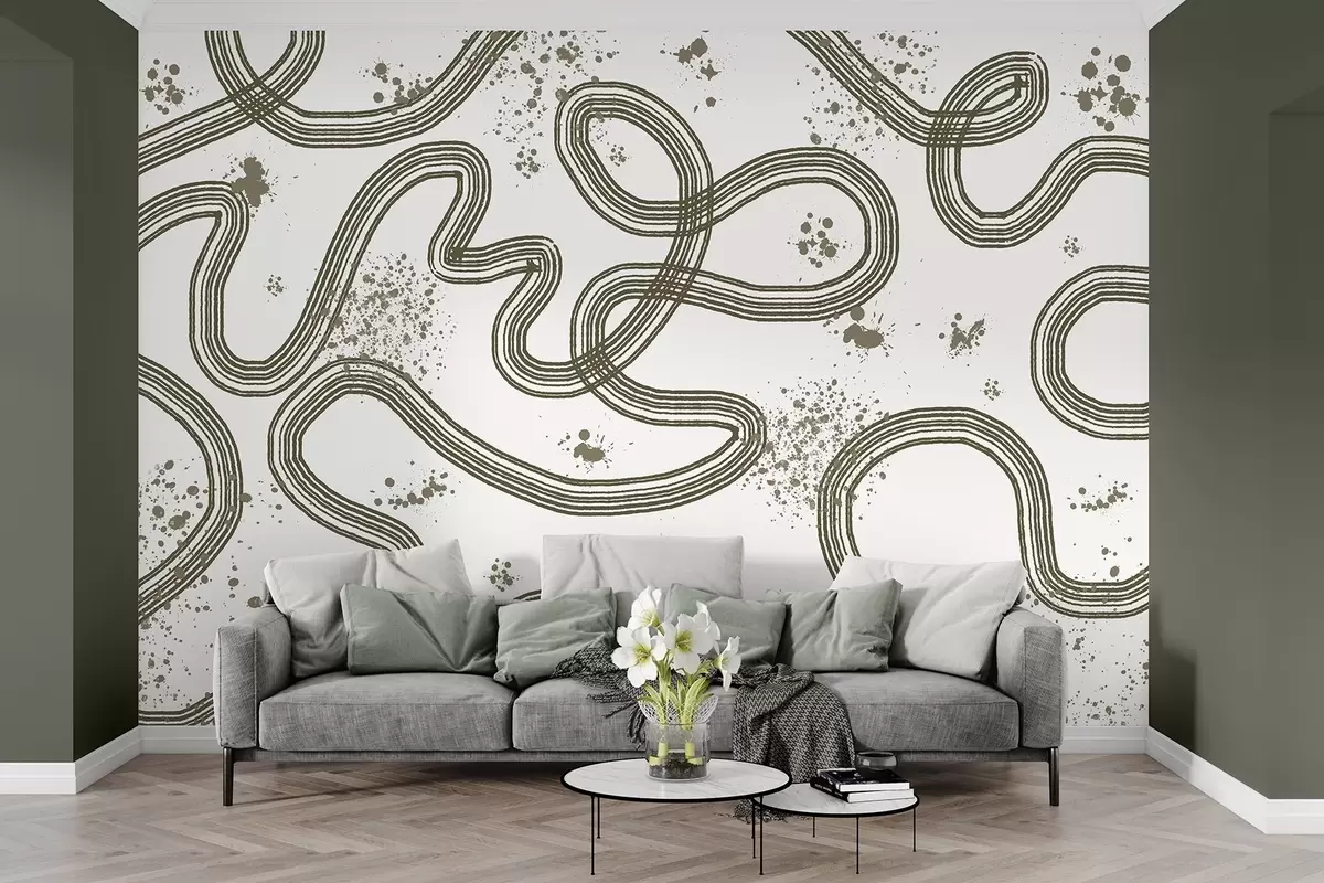 Murais de parede Desenho de linhas, salpicos de tinta, minimalismo, cor de azeitona Nr. w03408