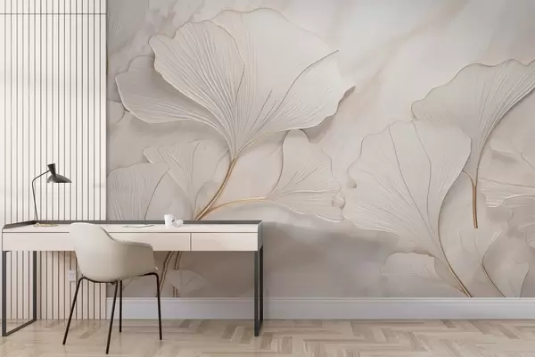 Murais de parede Folhas em tons pastel sobre um fundo de mármore em tons de bege Nr. w03440v1
