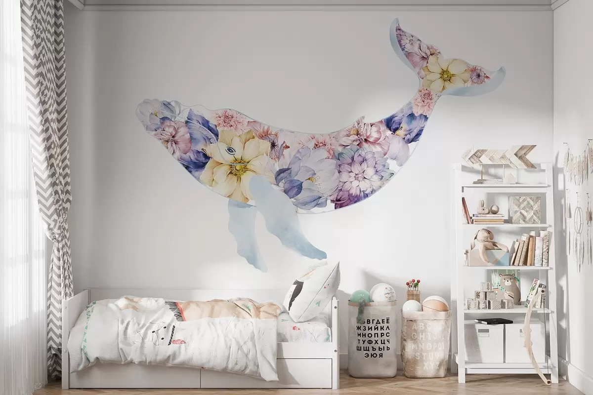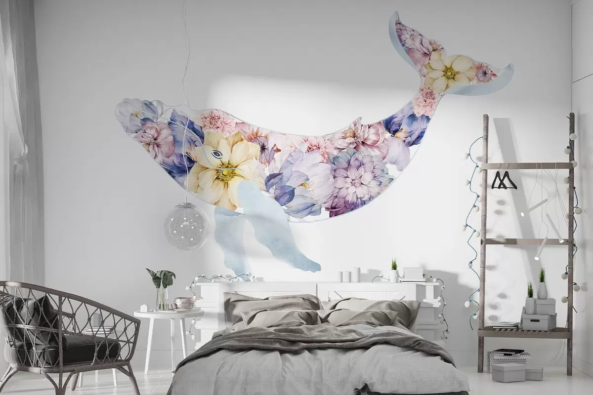 Murais de parede Bela baleia com flores de aguarela, animais marinhos, coloridos Nr. w03445