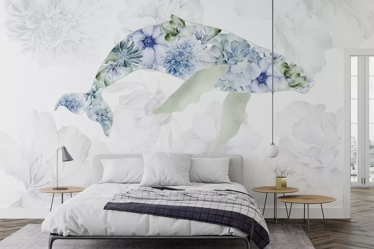 Murais de parede Baleia com flores em aguarela, animais do oceano, minimalismo, azul e verde Nr. w03446v2
