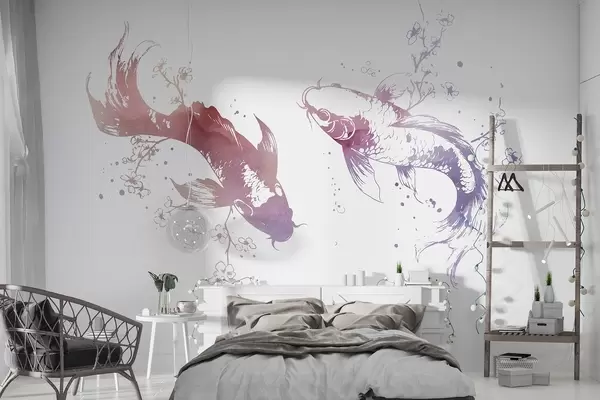 Murais de parede Peixe em aguarela, estilo oriental, cerejeira, cores púrpura Nr. w03447v1
