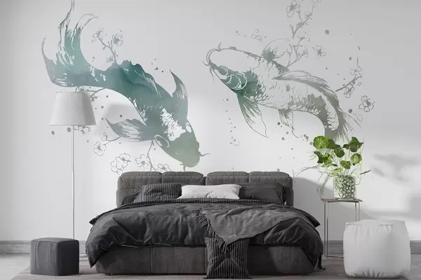 Murais de parede Peixe em aguarela, estilo oriental, cerejeira, cores verdes Nr. w03447v2