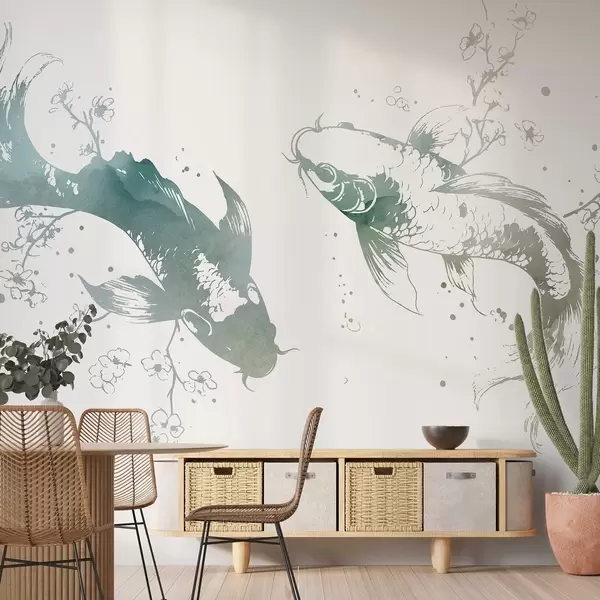 Murais de parede Peixe em aguarela, estilo oriental, cerejeira, cores verdes Nr. w03447v2