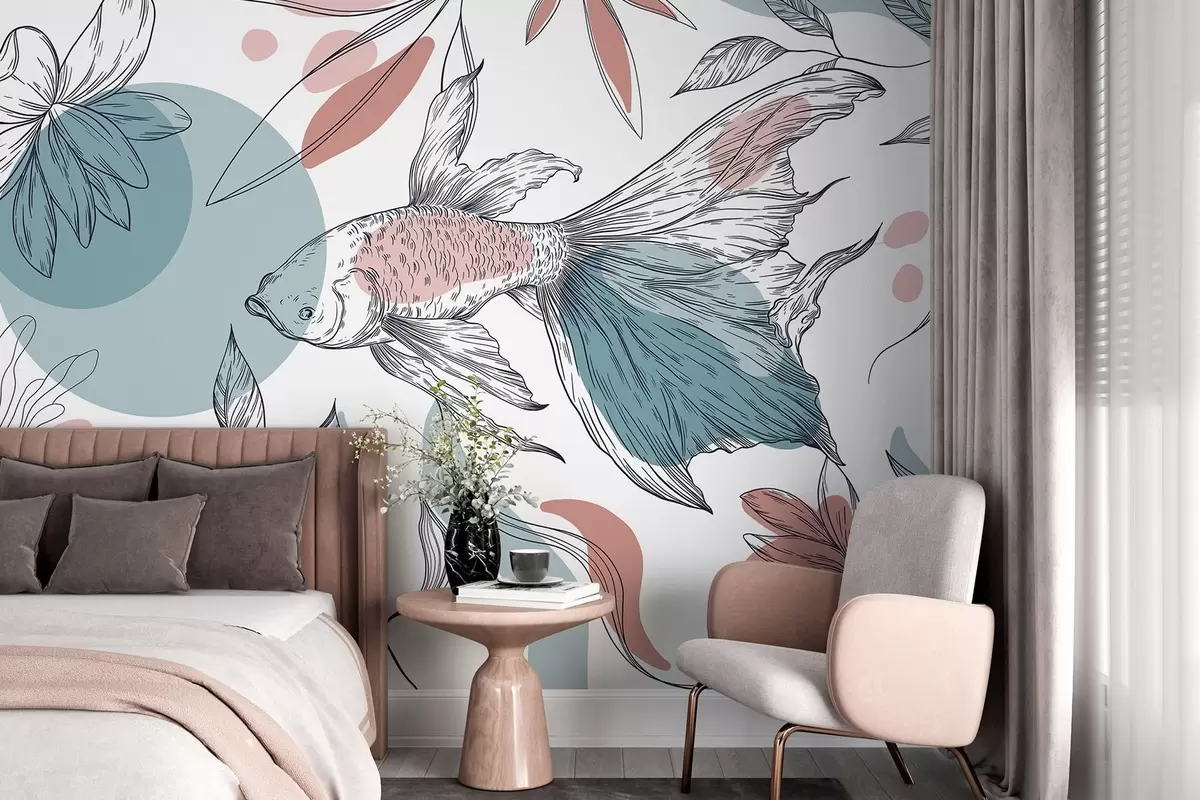 murais de parede Desenho de linhas de peixe com flores, minimalismo, marinho, floral, azul e cor-de-rosa  w03448v1