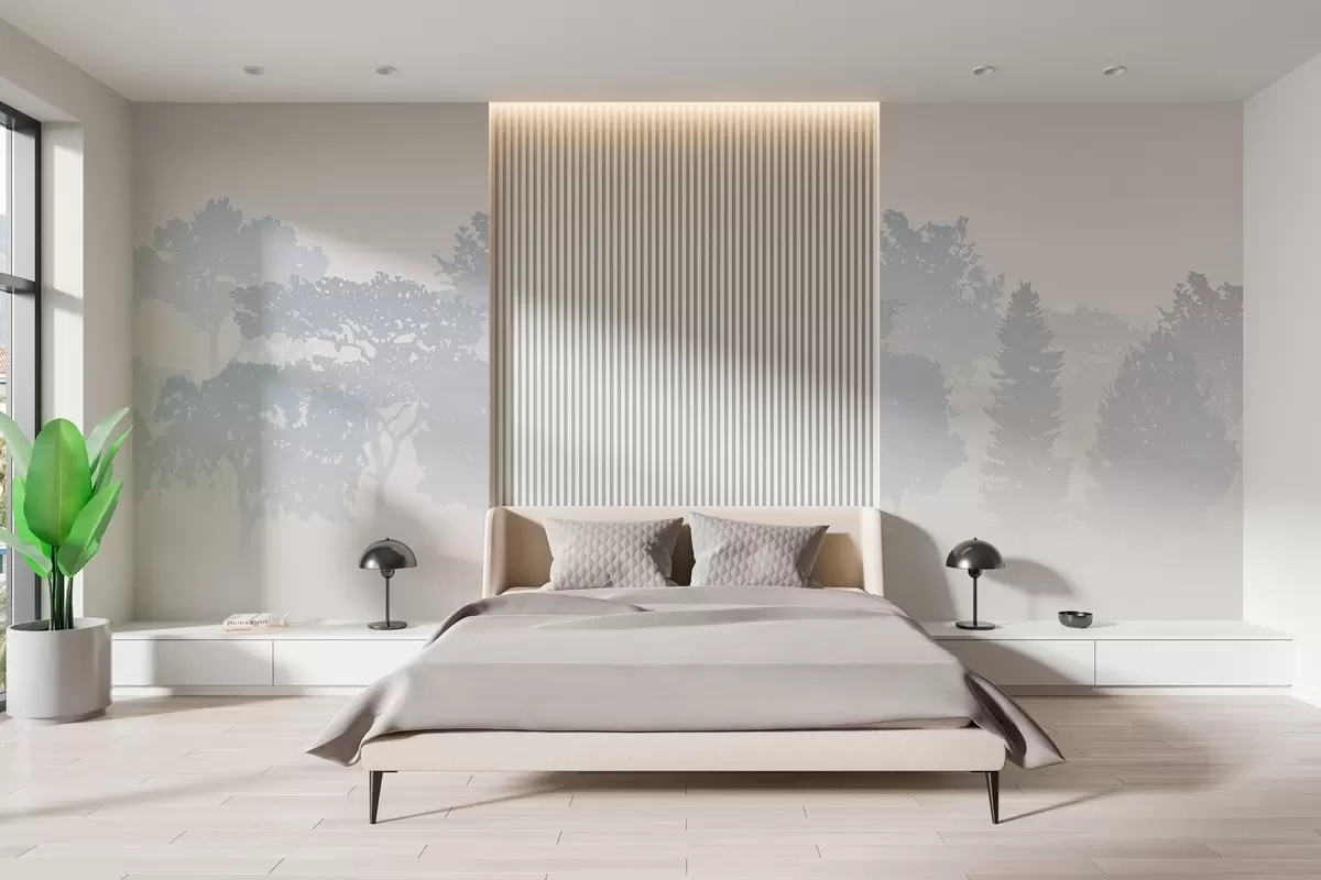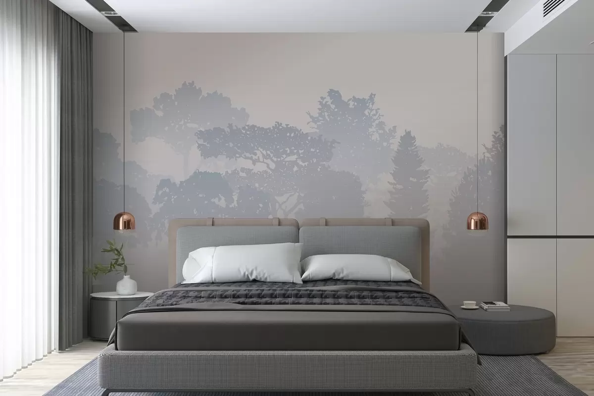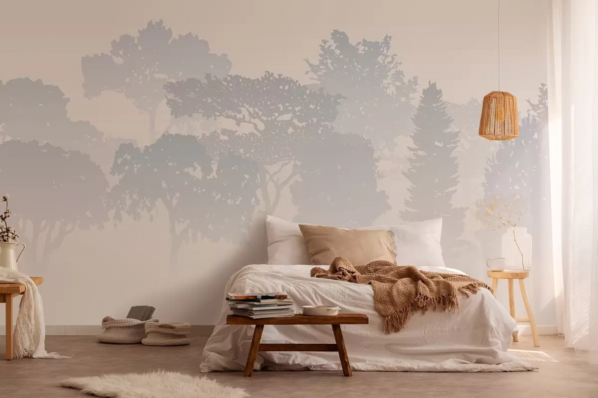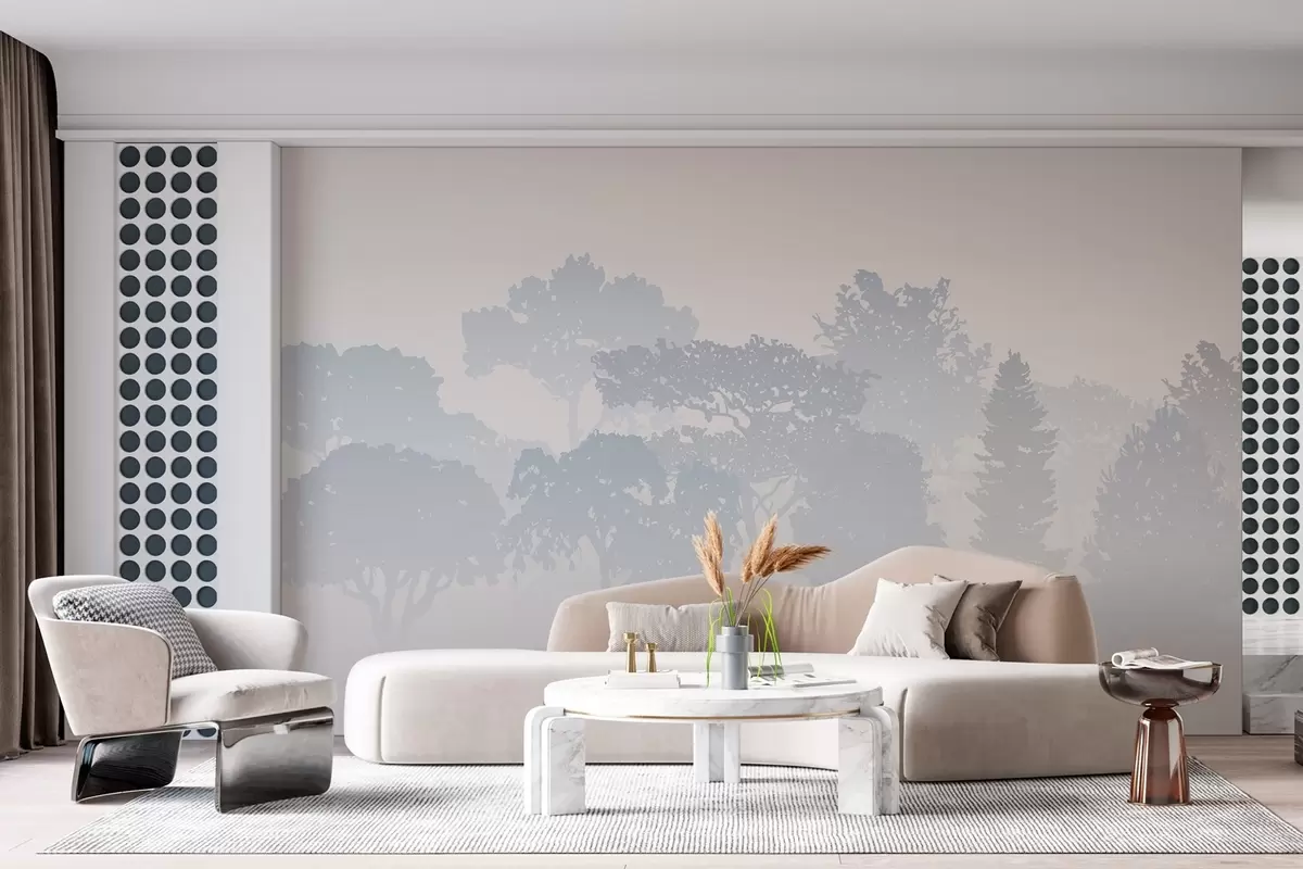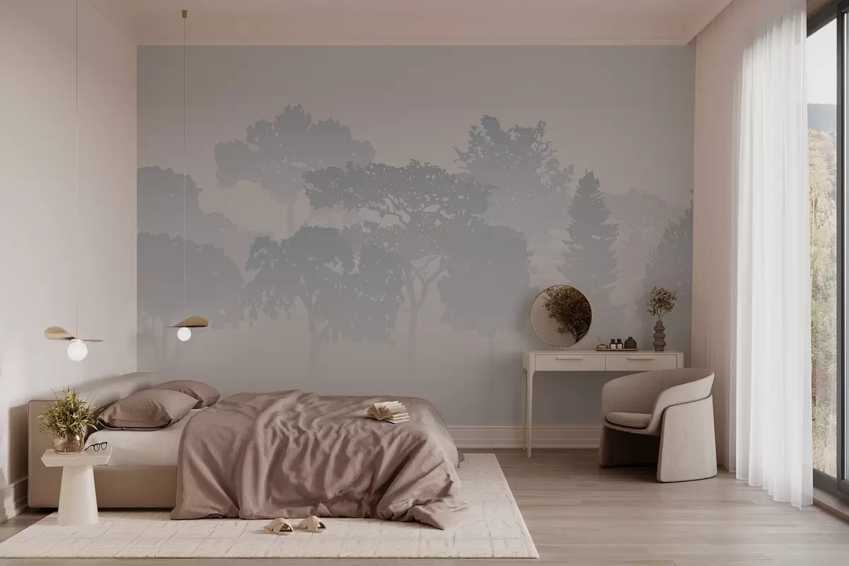 Murais de parede silhuetas de árvores na bruma do nevoeiro Nr. w03451