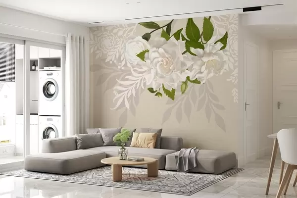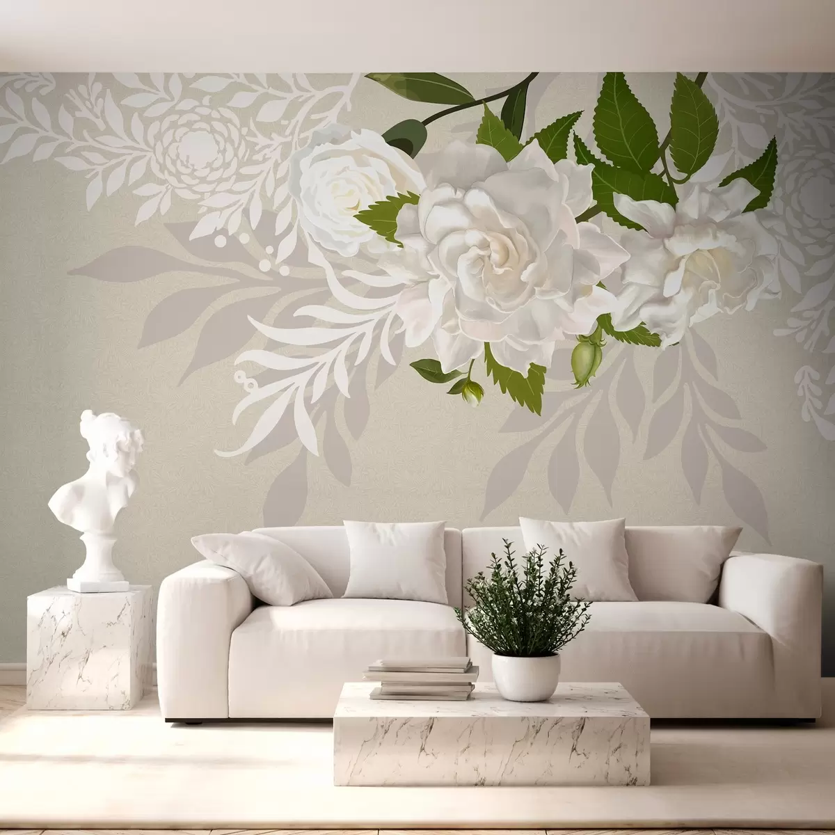 murais de parede rosas brancas sobre um fundo com padrão bege w03453