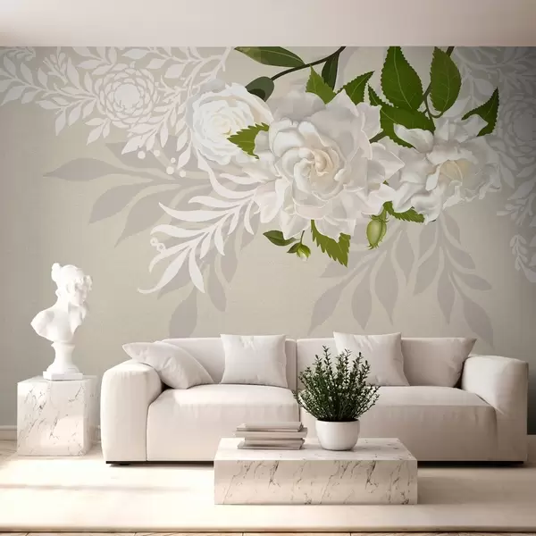Murais de parede rosas brancas sobre um fundo com padrão bege Nr. w03453