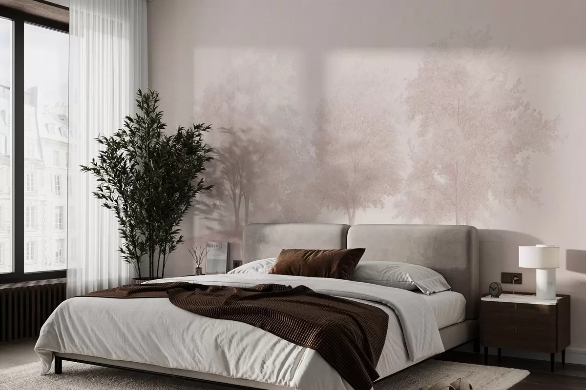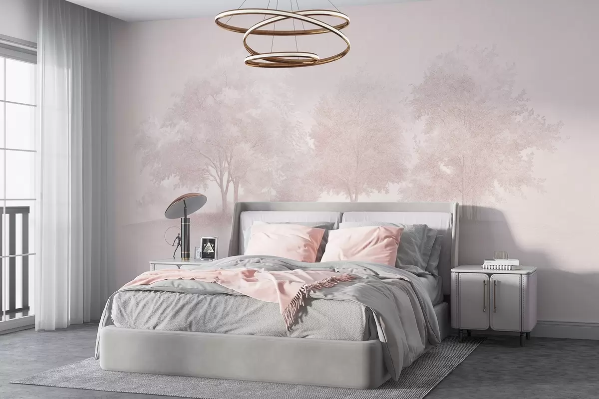 Murais de parede Árvores em flor, primavera, desenho a lápis, cores cor-de-rosa, natureza Nr. w03549