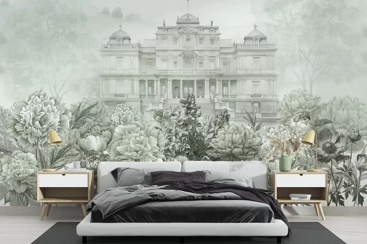 Murais de parede Palácio real com jardim de peónias, estilo aguarela, natureza, cores verdes, boho Nr. w03552v2