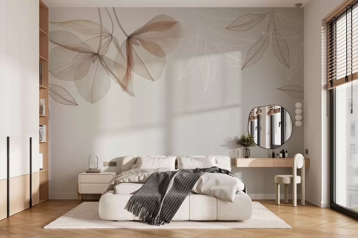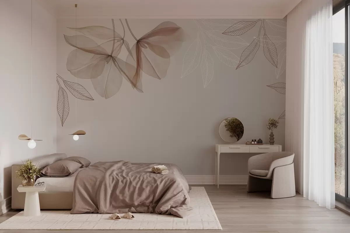 Murais de parede delicadas flores e folhas translúcidas em tons de moca Nr. w03616v3