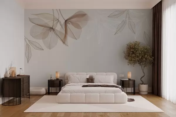 Murais de parede delicadas flores e folhas translúcidas em tons de moca Nr. w03616v3