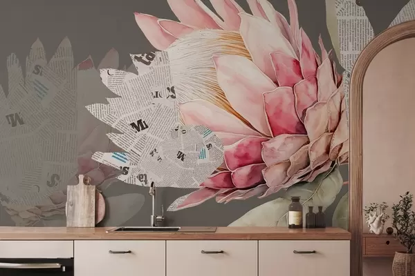Murais de parede Flores Protea, arte de jornal, floral, tropical, fundo verde Nr. w03667v1
