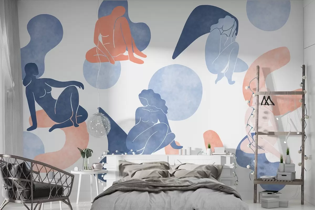 Murais de parede Abstracções geométricas com silhuetas femininas, estilo boho, azul, bege, rosa Nr. w03753v1