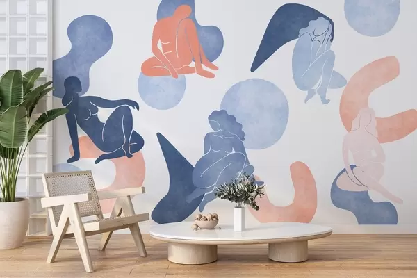 Murais de parede Abstracções geométricas com silhuetas femininas, estilo boho, azul, bege, rosa Nr. w03753v1